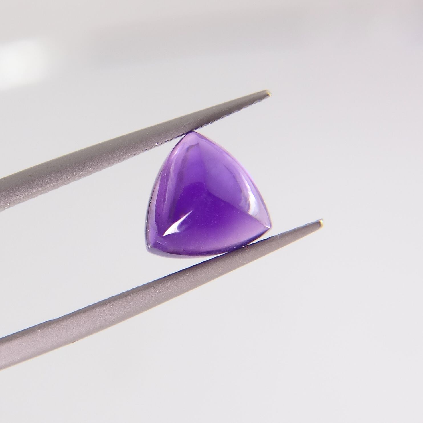ぽってりとした深い紫色のウルグアイ産天然アメシストを、丸みのある三角錐のピラミッドカットに磨いたピースです。